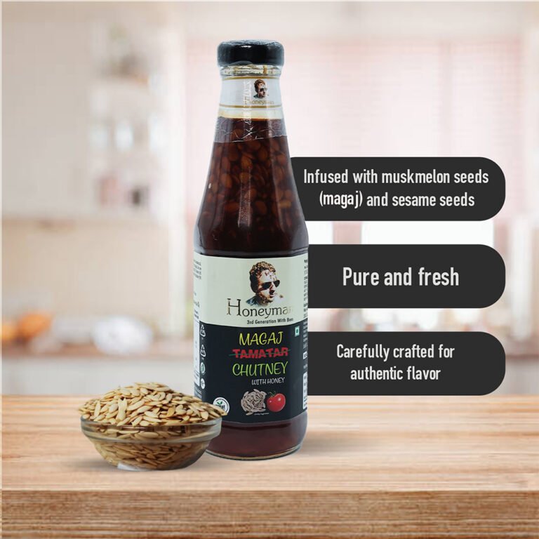 | Discover the rich, tangy flavour of Honeyman's Magaj Tamatar Chutney with Honey — a savory blend of tomatoes, melon seeds (magaj), and pure honey sweetness. A flavourful Indian condiment perfect for snacks and meals. 100% natural ingredients. Add a burst of authentic taste to your table. Order now! |