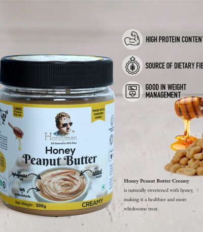 Savour the smooth, creamy indulgence of Honeyman's Honey Peanut Butter Creamy — a rich blend of finely roasted peanuts and pure natural honey. High in protein and healthy fats, it's perfect for toast, smoothies, and baking. A healthier, naturally sweetened spread. Order Honeyman's best today!