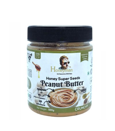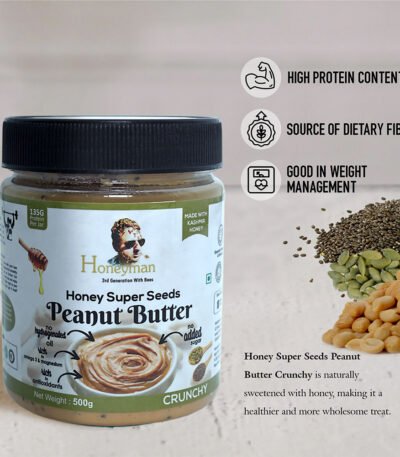 Power up with Honeyman's Honey Super Seeds Peanut Butter — an extraordinary blend of roasted peanuts, pure honey, and nutrient-dense seeds. Packed with Omega-3, protein, and fibre, it's the ultimate fitness and wellness spread. 100% natural. Fuel your body the smart way. Order today!